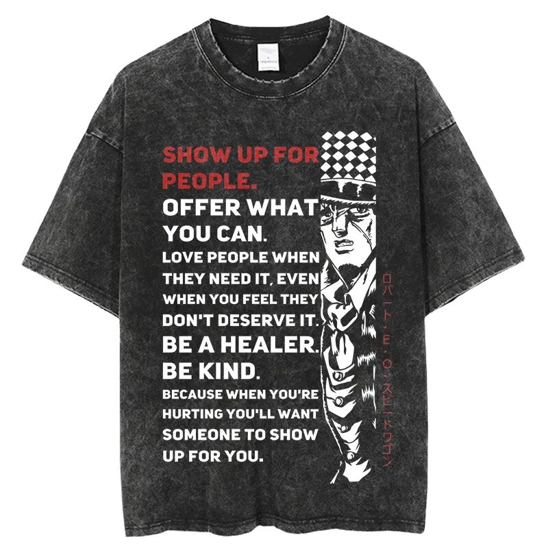 JoJo's Bizarre Adventure Be Kind Vintage T-Shirt. Premium 100% cotton tee featuring a bold, vintage-inspired Jojo's Bizarre Adventure graphic. Oversized fit for a relaxed, streetwear look. Soft, breathable fabric. Ribbed crew neck. Double-stitched sleeves and hem. Sizes S-3XL. Machine wash cold, inside out. Perfect forJojo's Bizarre Adventure fans and casual anime style. Durable print stays vibrant. Ideal for everyday wear or cosplay events.