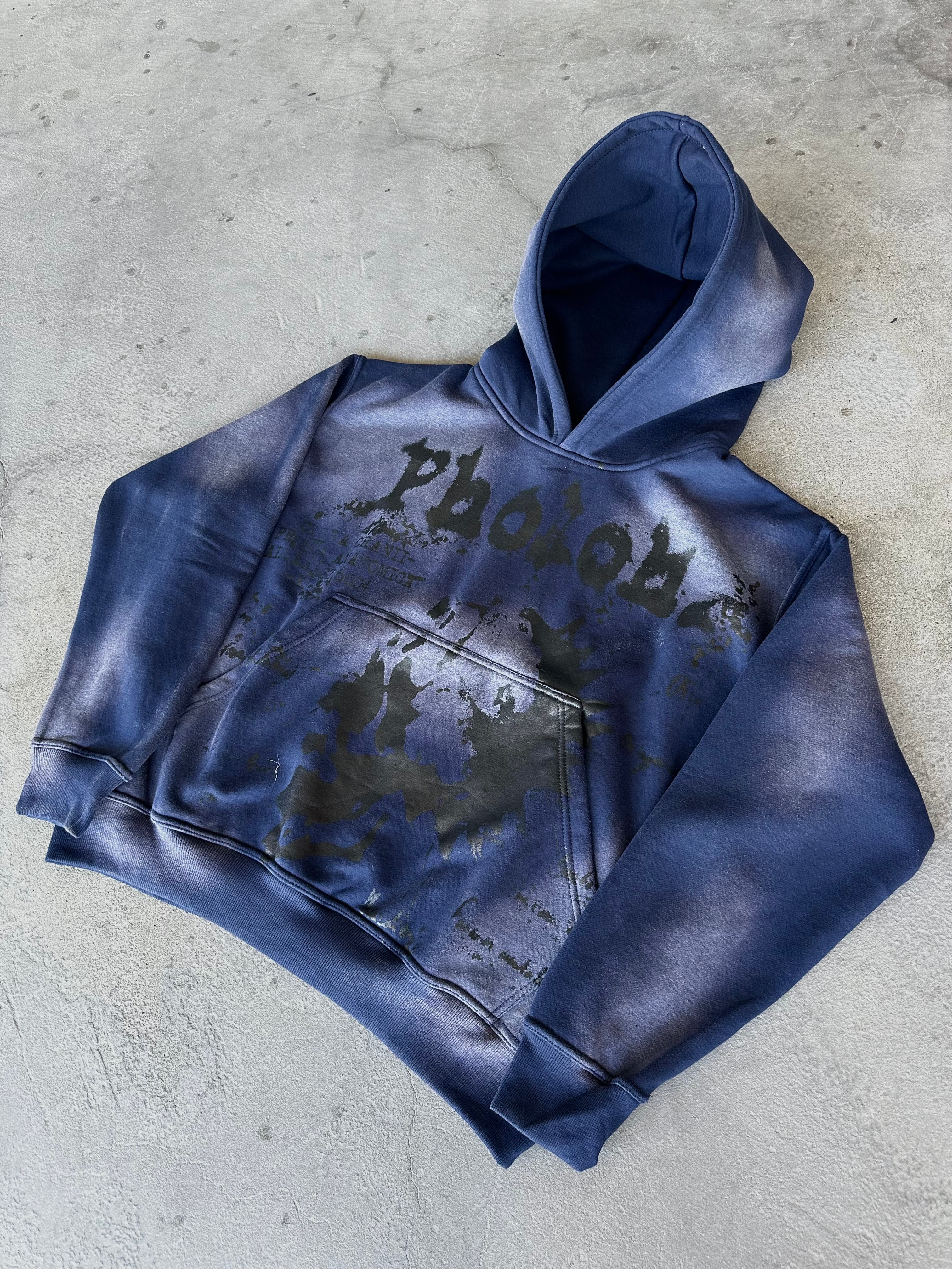 These garments are made out of 400 GSM Cotton in a Washed Navy. We used a bleach type of wash to show all the different spots marked throughout the hoodie. This hoodie comes with an Oversized Pocket and Hood. On the front, there is a black water-based screen print to have that 'no feel' touch. Each piece comes with there own woven label and fits true to size. Priced at $50